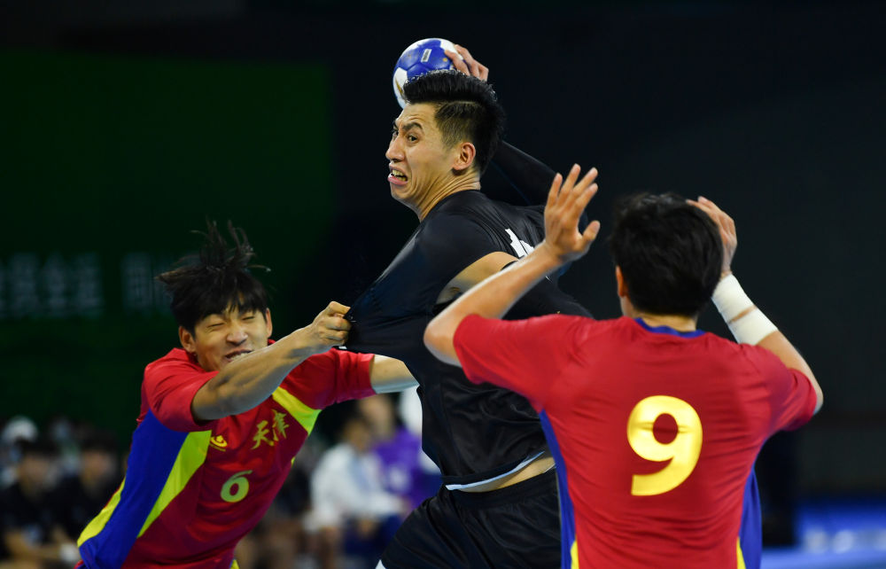 在上届全运会男子手球决赛中,江苏队战胜山东队,取得了全运会三连冠。本届全运会,这对老对手将在半决赛狭路相逢。