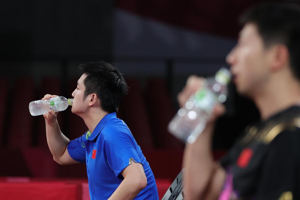 7月30日,樊振东(左)和马龙在比赛间隙休息。新华社记者王东震摄